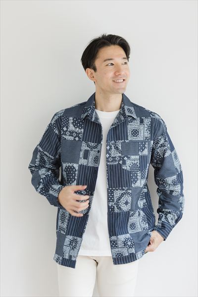パッチワーク オーバーシャツ Color:ブルー ¥25,300(tax in)